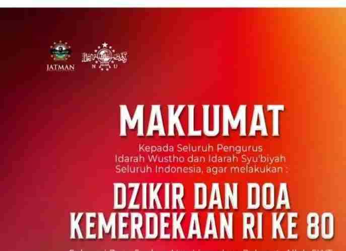 GRESIk menaramadinah.com – Idarah ‘Aliyah Jam’iyyah Ahlith Thariqah al-Mu’tabarah an-Nahdliyah (Jatman) mengeluarkan Maklumat dengan menyerukan kepada seluruh pengurus Idarah Wustha dan Idarah Syu’biyah di seluruh Indonesia mengadakan acara dzikir dan doa bersama secara serentak. Pukul 19.00-selesai besok 10 Agustus 2025 / 6 Syafar 1447 H di masing masing masjid di daerah secara mandiri.