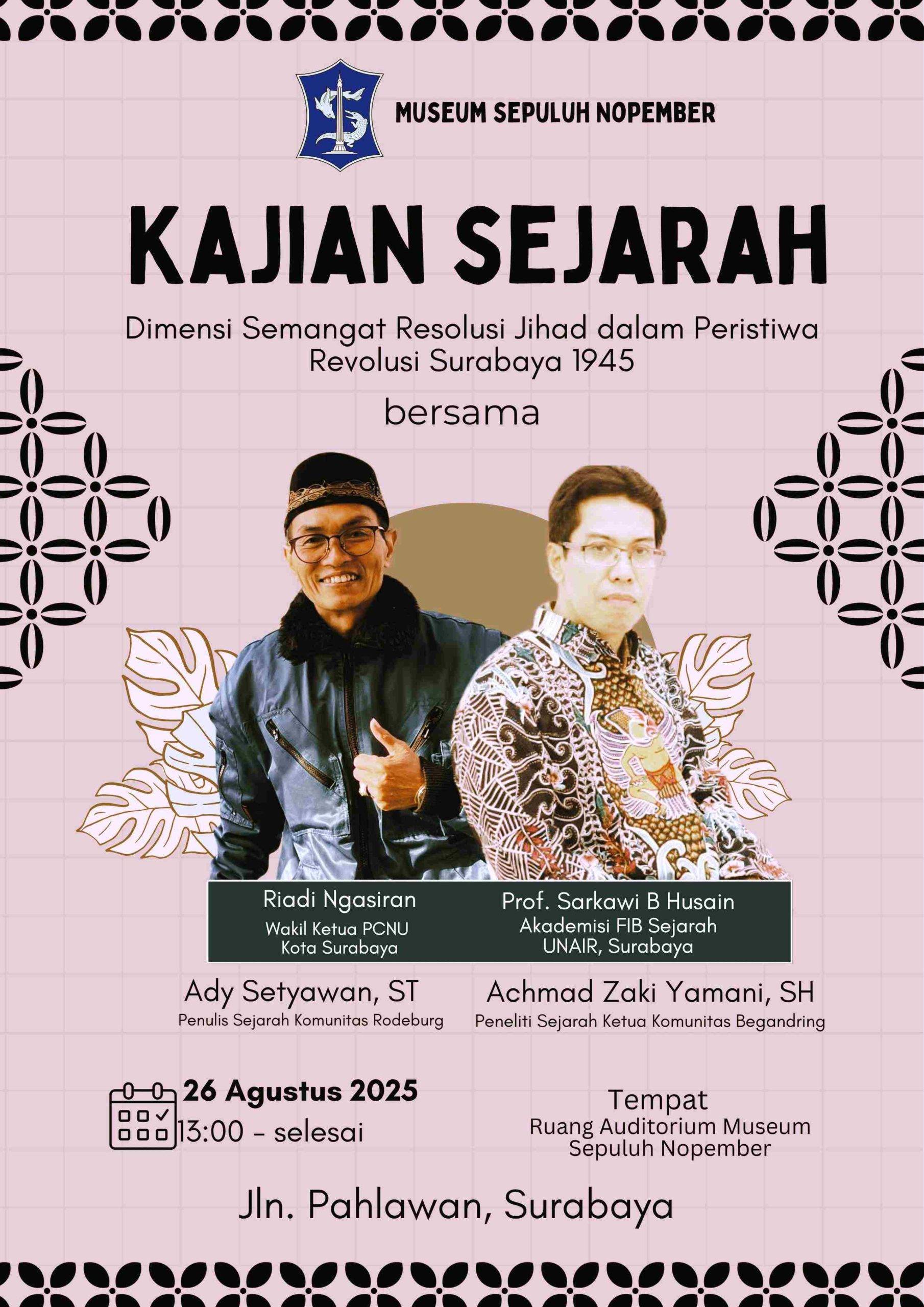 Kajian Sejarah itu diadakan diauditorium Museum Sepuluh November Surabaya pada 26 Agustus 2025 pukul 13.00 wib-16.00 wib.