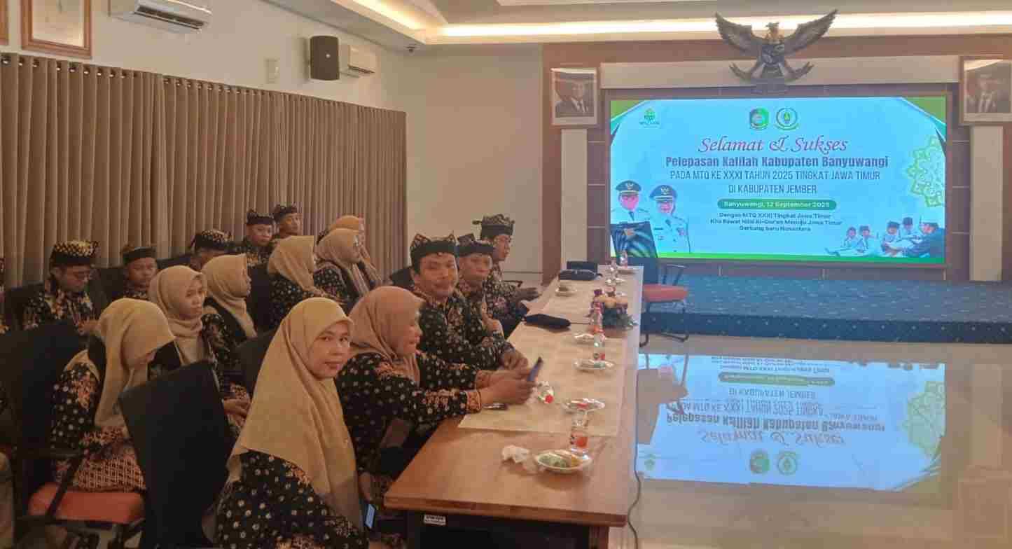 Banyuwangi – Sebanyak 34 kafilah Musabaqah Tilawatil Qur’an (MTQ) Kabupaten Banyuwangi resmi dilepas menuju MTQ Tingkat Provinsi Jawa Timur ke-XXXI yang digelar di Jember pada 12–19 September 2025. Prosesi pelepasan berlangsung di Aula Rempeg Jogopati, Kamis (12/9/2025).