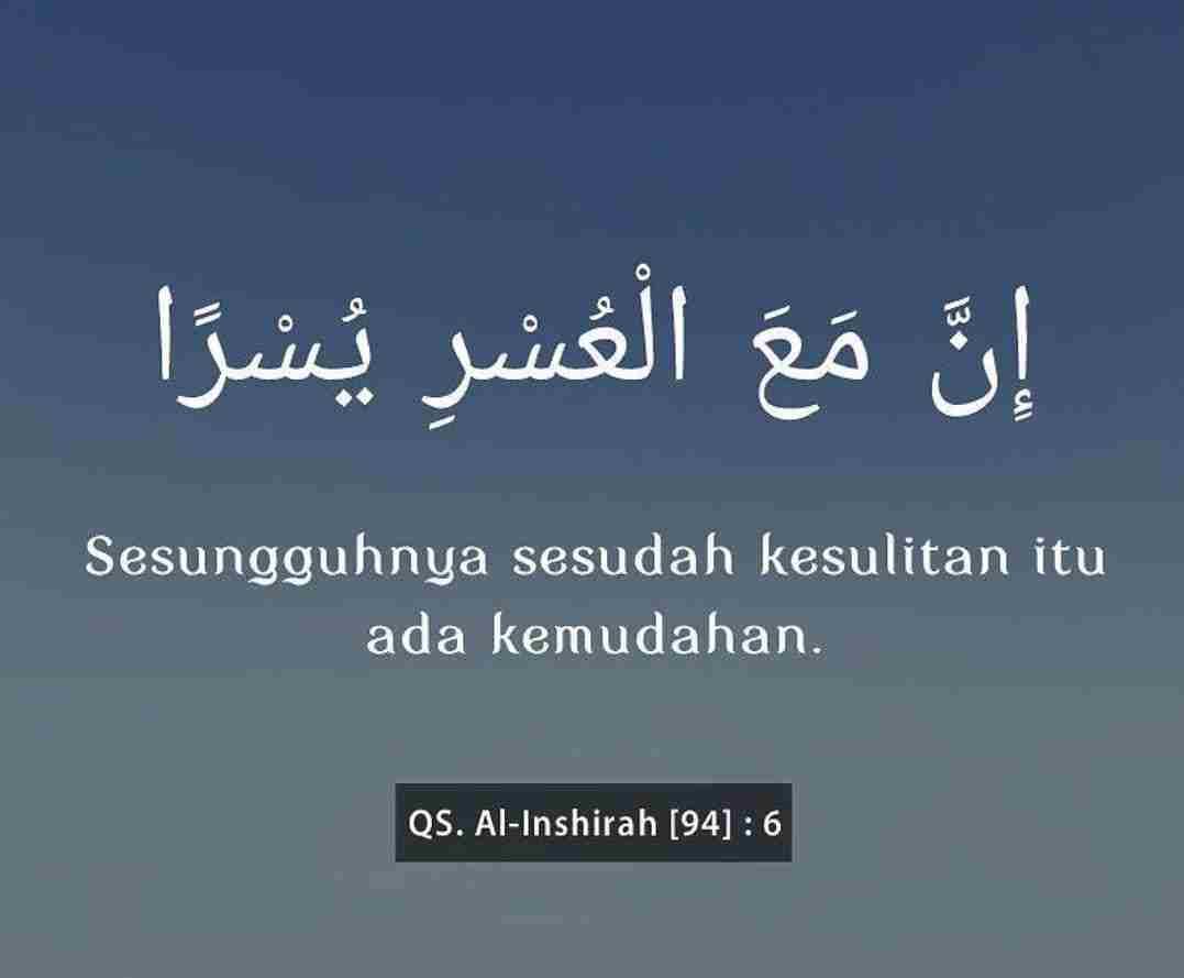 Sungguh kalimat tersebut meringankan beban untuk menahan kesulitan serta mengurangi bahkan bisa menghilangkan potensi putus asa. Kalimat tersebut adalah bagian dari ayat Al-Qur’an, yaitu Surat Al-Insyirah ayat 5-6: