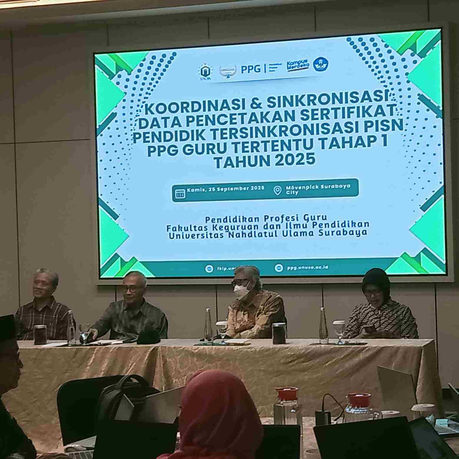 Surabaya — Fakultas Keguruan dan Ilmu Pendidikan (FKIP) Universitas Nahdlatul Ulama Surabaya (UNUSA) diminta untuk terus bermimpi besar sekaligus konsisten melakukan langkah-langkah kecil yang berdampak nyata. Hal ini disampaikan oleh Rektor UNUSA dalam sambutannya pada acara Koordinasi dan Sinkronisasi Data Pencetakan Sertifikat Pendidikan Tersinkronisasi PISN PPG Guru Tertentu Tahap 1 Tahun 2025, Kamis (25/9/2025) di Hotel Movenpick Surabaya City.