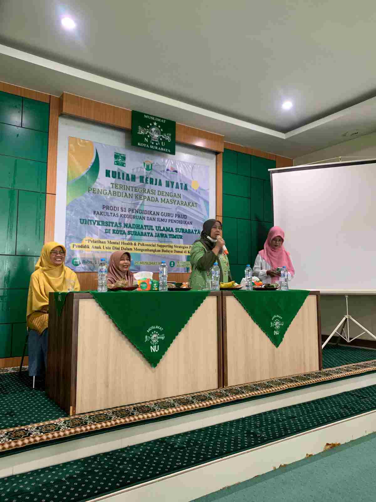 Surabaya, 11 Juni 2025 – Fakultas Keguruan dan Ilmu Pendidikan (FKIP) Universitas Nahdlatul Ulama Surabaya (UNUSA) menyelenggarakan Pelatihan Pendidikan Mental Health dan Psikososial Supporting Strategies bagi pendidik PAUD. Kegiatan ini diikuti oleh guru-guru PAUD binaan Muslimat NU dengan tujuan meningkatkan pemahaman dan keterampilan dalam menciptakan suasana belajar yang sehat, damai, serta ramah anak di kelas.