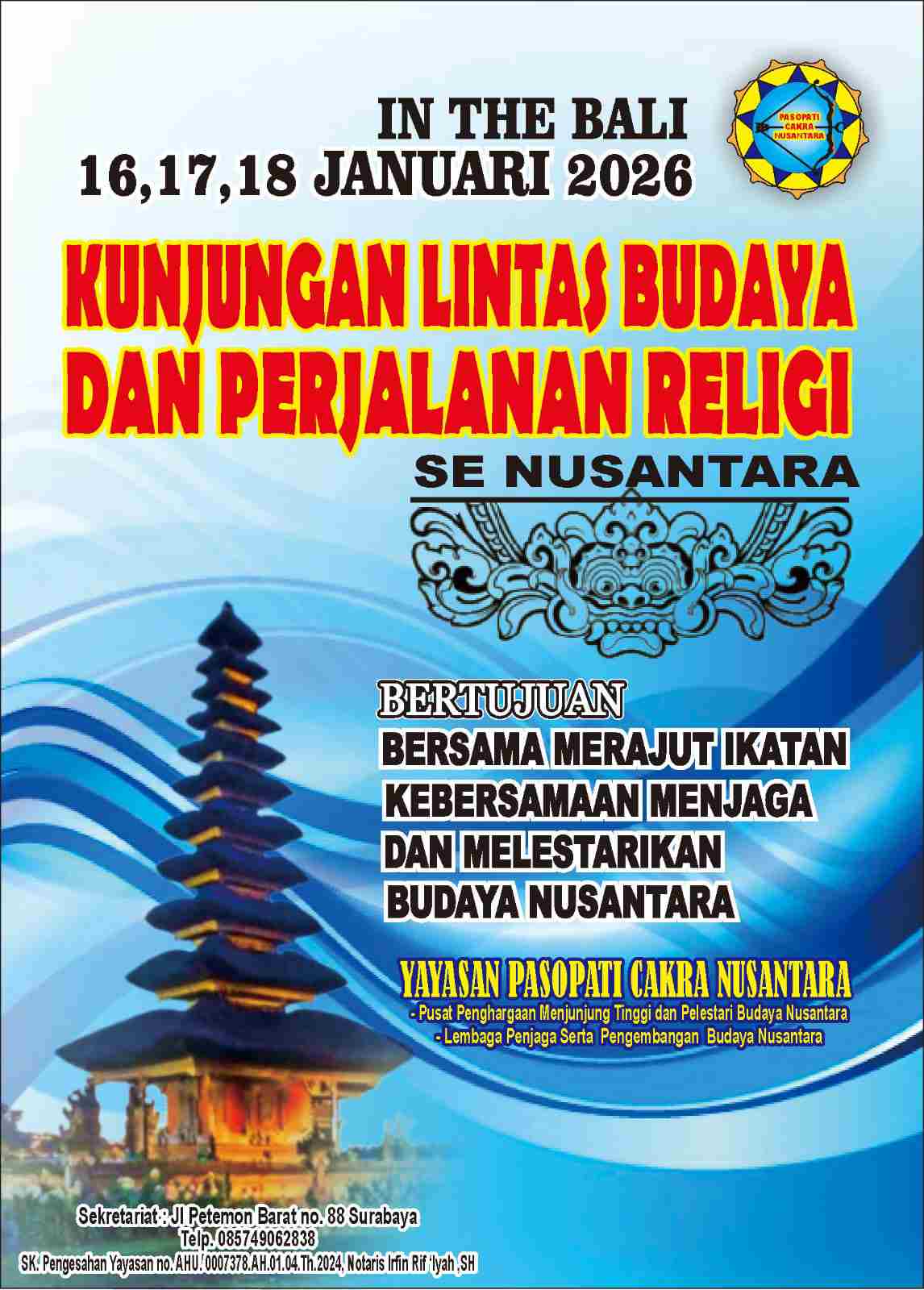 Surabaya-menaramadinsh.com-Pasopati Cakra Nusantara menuju Pemajuan Kebudayaan secara Meluas dalam kunjungan Lintas Budaya di Bali pada Tanggal 16, 17, 18 Januari 2026 menjadi prioritas Program Awal Yayasan Pasopati Cakra Nusantara tahun 2026.