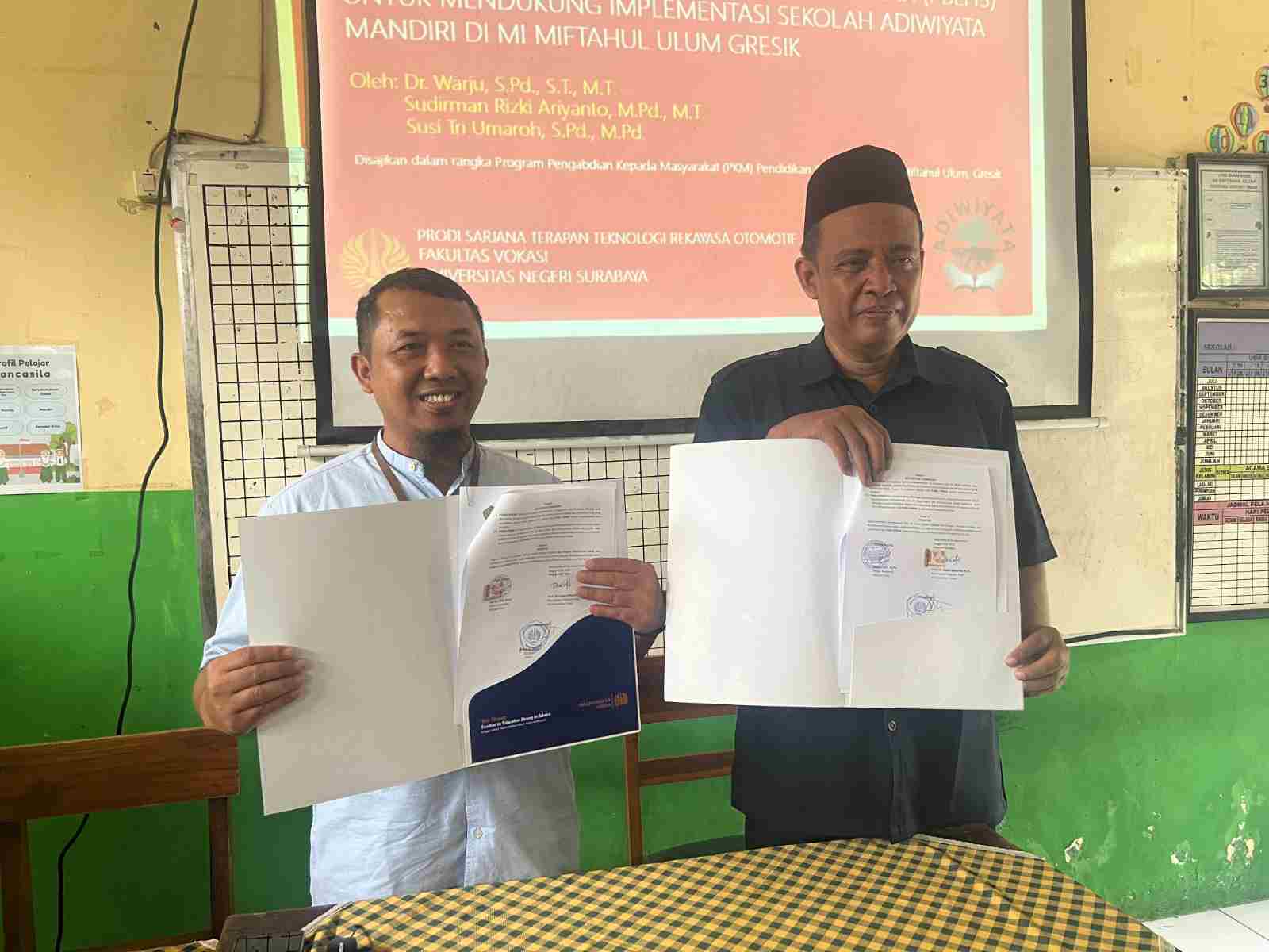 ”Semoga dengan ditandatanganinya naskah MoA ini, ke depan pendampingan oleh Unesa akan semakin banyak dan berkelanjutan sesuai dengan kebutuhan sekolah,” ujar Warju mengawali sambutan. Setelah itu, dilakukan penandatanganan naskah kerjasama antara Koorprodi S3 Pendidikan Vokasi Sekolah Pascasarjana Unesa dengan Kepala Madrasah MI Miftahul Ulum.