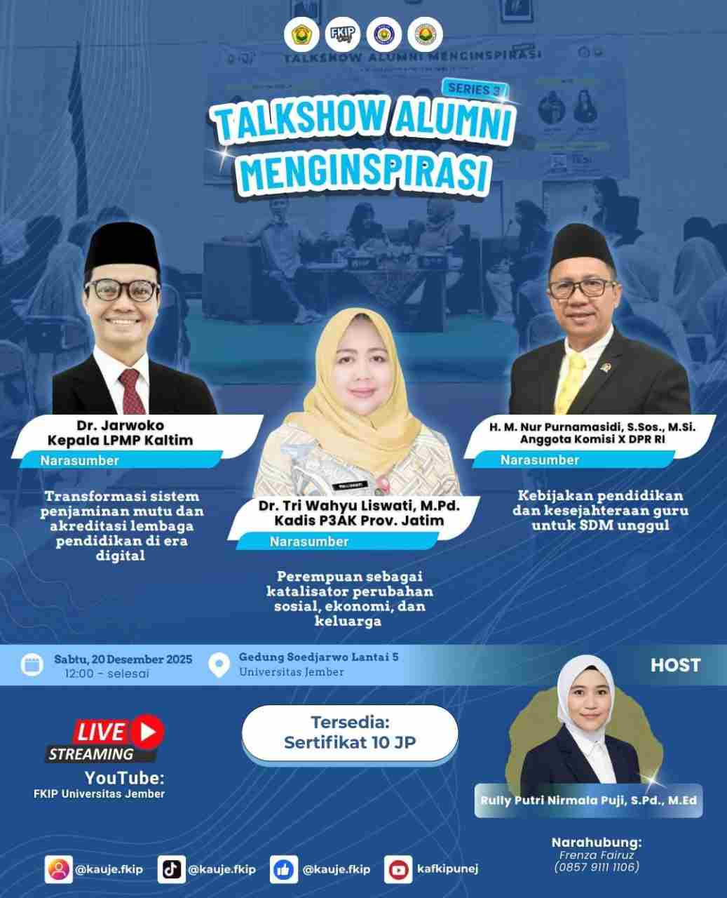 Reuni Akbar KA FKIP UNEJ diawali dengan acara Talk Show Alumni Menginspirasi pada pukul 12.00 wib dengan pembicara Dr. Jawoto Ketua LPMP Kaltim, Dr. Tri Wahyu Liswati, M.Pd KA Dinas P3AK Provinsi Jatim dan H. Nur Purnomosidi, M.Si. sebagai Hos adalah Rully Putri Nirmala Puii, M Ed.