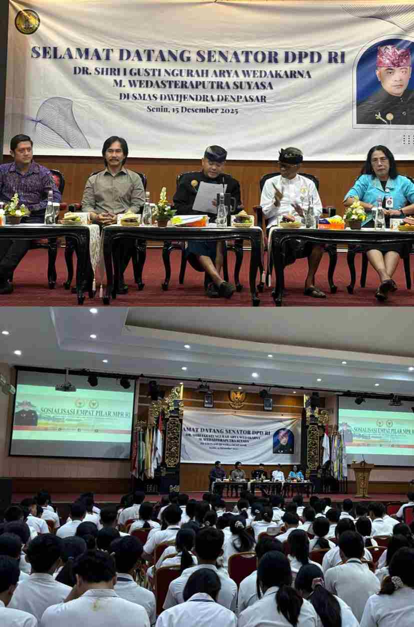 Denpasar, 15 Desember 2025 – SMA Dwijendra Denpasar menjadi tuan rumah kegiatan sosialisasi Empat Pilar MPR RI yang bertajuk “Dalam Genggaman Generasi Milenial: Menjadi Pelajar Berintegritas di Era Digital”. Acara ini digelar di Aula SMA Dwijendra, Jalan Kamboja No.17, Kota Denpasar, dan dihadiri oleh seluruh siswa-siswi, guru, serta jajaran civitas akademika sekolah. Sosialisasi ini memiliki tujuan strategis untuk menanamkan nilai-nilai Empat Pilar MPR RI, yaitu Pancasila, UUD 1945, NKRI, dan Bhinneka Tunggal Ika, kepada generasi muda. Nilai-nilai tersebut diharapkan dapat diterapkan dalam kehidupan sehari-hari, khususnya di era digital yang menuntut kecermatan, integritas, dan etika dalam berinteraksi.