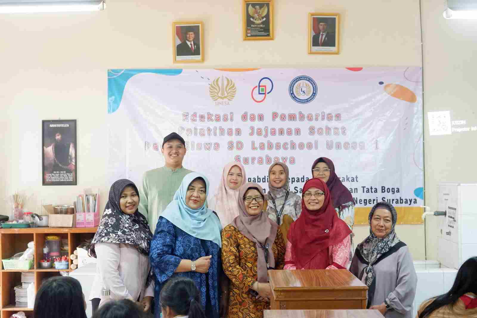 Surabaya —menaramadinah.com- Program Studi Sarjana Terapan (D4) Tata Boga, Fakultas Vokasi Universitas Negeri Surabaya (Unesa) menuntaskan kegiatan Pengabdian kepada Masyarakat (PKM) di SD Labschool Unesa 1 Surabaya bertajuk “Edukasi dan Pemberian Pelatihan Jajanan Sehat pada Siswa Sekolah Dasar Labschool Unesa 1 Surabaya.” Kegiatan ini dilaksanakan pada 17 Oktober di lingkungan SD Labschool Unesa 1 Surabaya.