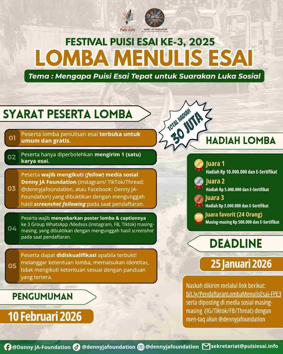 Di tengah dunia yang gaduh, banyak luka sosial tak pernah terdengar. Diakui secara internasional (ASEAN & BRICS Award 2025), PUISI ESAI hadir bukan sekadar sebagai karya sastra, tetapi menjadi jembatan antara seni, fakta, dan advokasi sosial.