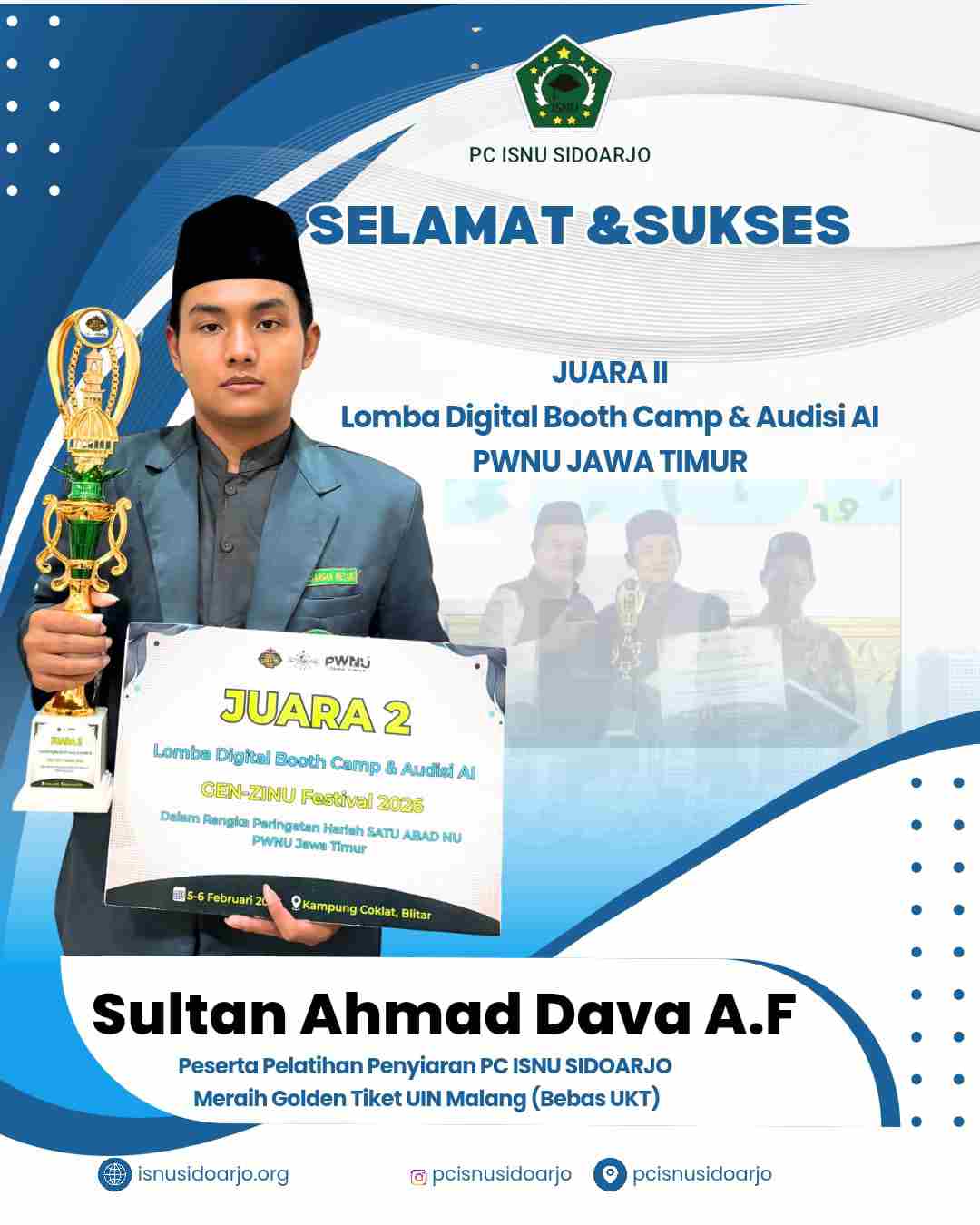 Blitar – Sultan Ahmad Dava, Peserta Pelatihan Penyiaran Televisi yang digelar Ikatan Sarjana Nahdlatul Ulama (ISNU) Sidoarjo berhasil menorehkan prestasi membanggakan dengan meraih Juara 2 (Runner Up) dalam ajang AI Boot Camp Competition Pengurus Wilayah Nahdlatul Ulama (PWNU) Jawa Timur. Grand Final kompetisi tersebut digelar pada Kamis, 5 Februari 2026 di Kampung Coklat, Kabupaten Blitar. Prestasi ini diabadikan dalam foto Sultan Ahmad Dava saat menerima penghargaan di Kampung Coklat Blitar, menampilkan hasil karya Booth Camp PWNU Jatim dan Audisi AI yang menginspirasi dakwah digital NU Jawa Timur.