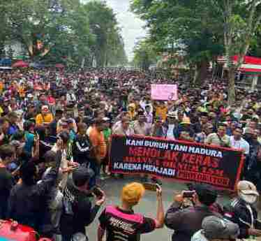 Massa juga membentangkan banner bertuliskan “Kami Buruh Tani Madura Menolak Keras Adanya Oknum LSM karena Menjadi Provokator”.