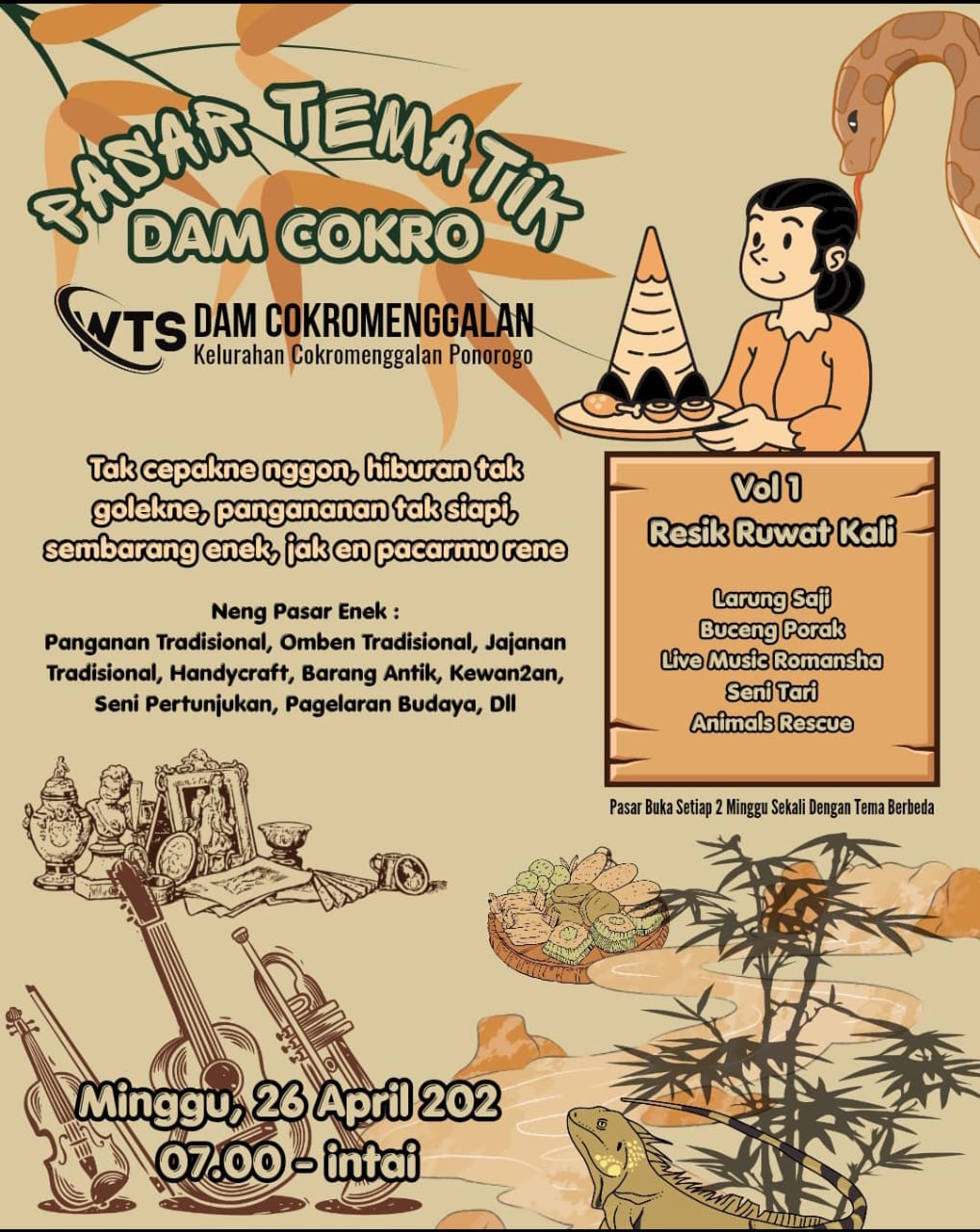 Salah satunya Dari Usaha Meningkatkan Pariwisata & Ekonomi Masyarakat, seperti yang di lakukan dengan mengadakan ” PASAR TEMATIK ” DAM COKRO. Yang bertempat di Kelurahan Cokromenggalan ini.