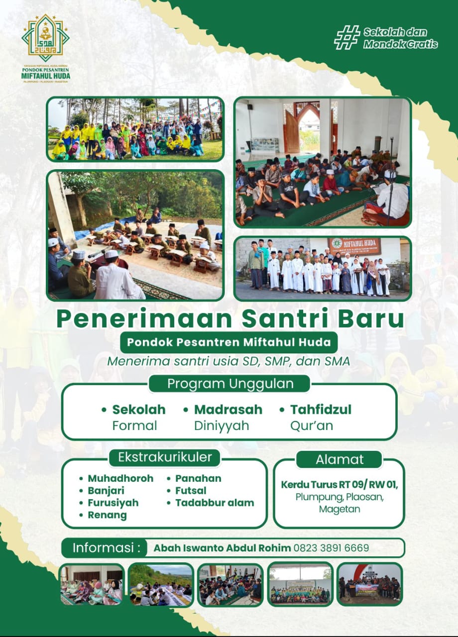 Salah Satu Pondok Pesantren yang Komitmen & Aktif Melahirkan Santri & Putra Putri terbaik adalah Pondok Pesantren Miftahul Huda,Kedu Turus,Plumpung Plaosan Magetan.Pesantren Yang Berdiri sejak Tahun 2017 I, Menurut Cetirita Pimpinannya ,Berawal dari Kandang kambing, Alhamdulillah sekarang sudah menjadi pondok & Bisa membimbing santri dari Berbagai daerah . Kelebihannya lagi Ponpes ,Yang di Asuh Oleh Kyai Muda ( Kang Is ) Begitu Orang – Orang biasa memanggil ,di sini pondok ini gratis.Namun Walaupun Gratis Tdk mengurangi Dalam hal Pelayanan & Kwalitas pendidikan yang di berikan.