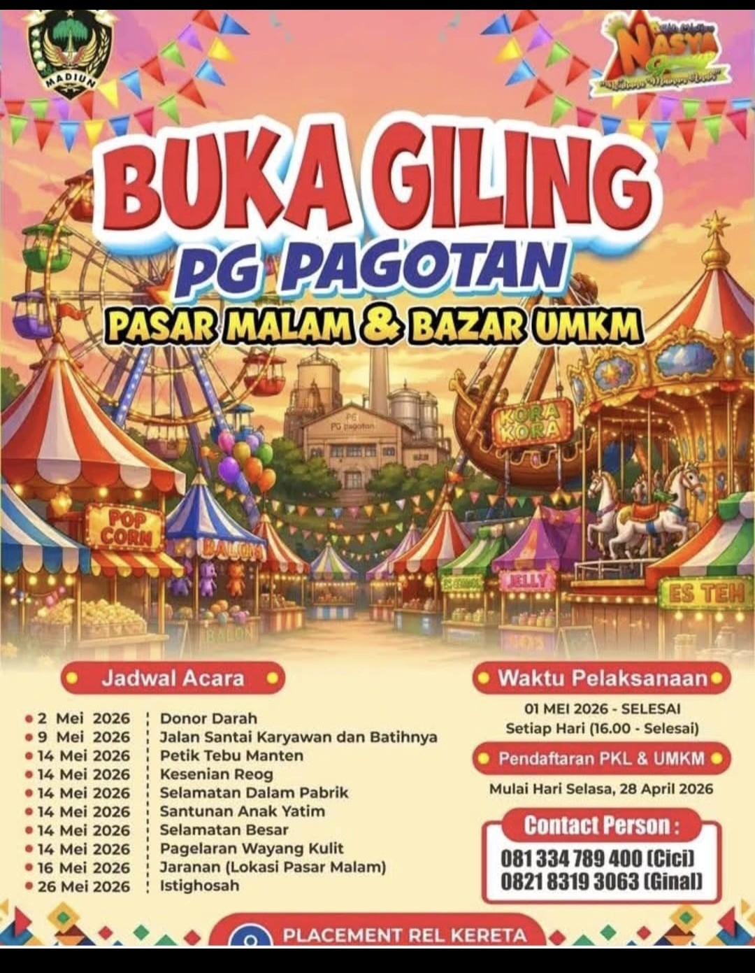 Itulah Beberapa acara yang akan di sajikan di acara Buka giling 2025,PG Pagotan – Madiun. Terhitung Waktu Pelaksanaan 01 Mei – Sampai Selesai ( Setiap hari ( 16.00 – Selesai ). Namun untuk Para PKL & Pelaku UMKM di buka Pendaftaran, Untuk Mengisi Acara Tersebut di mulai Hari Selasa, 28 April 2026.