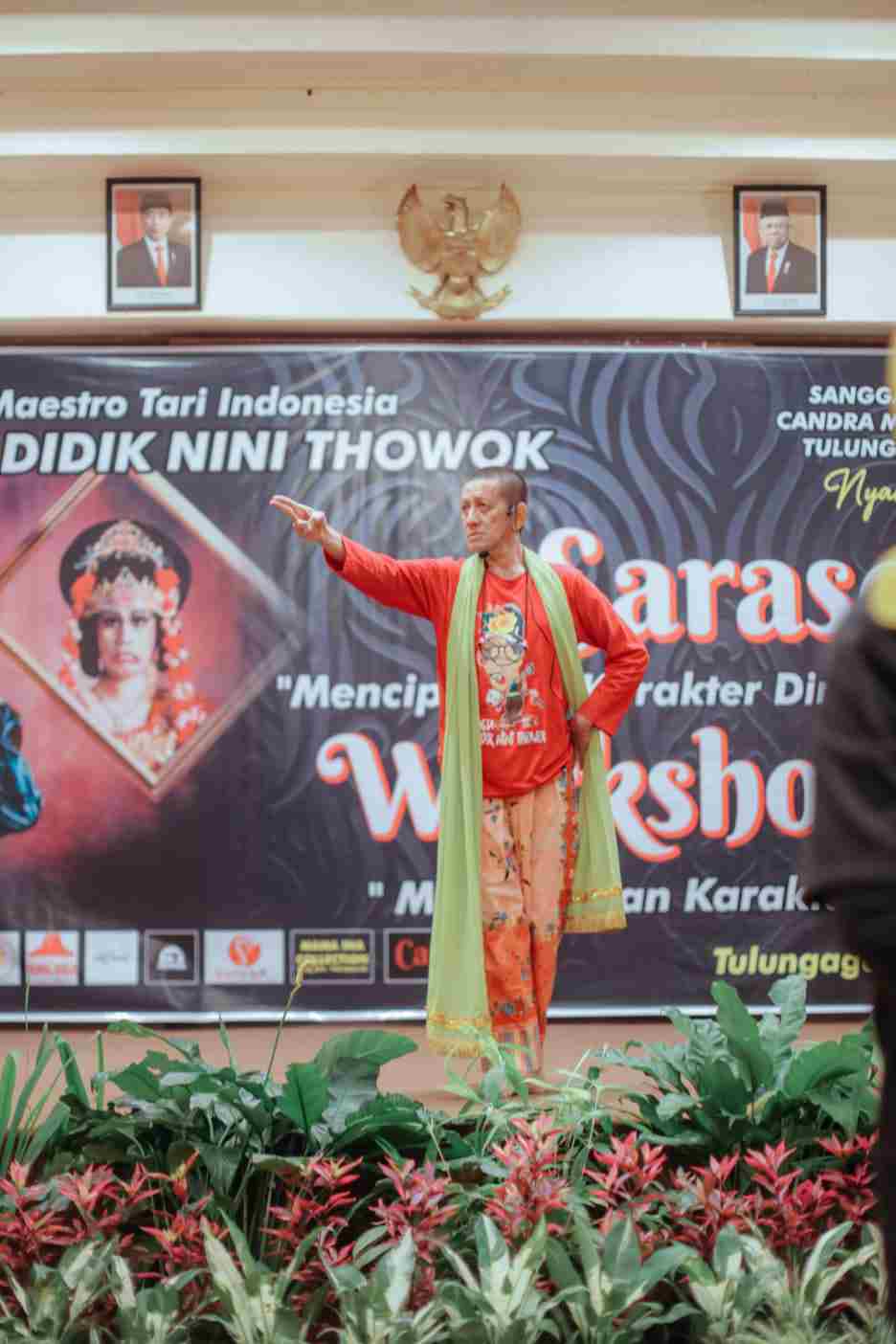 Maestro Tari Indonesia, Didik Nini Thowok menghipnotis sekitar 100 orang peserta sarasehan workshop dengan tema “Menciptakan Karakter Kepenarian” di hall Narita Hotel Tulungagung, Minggu (12/6) siang. Berikut laporan Wawan Susetya :