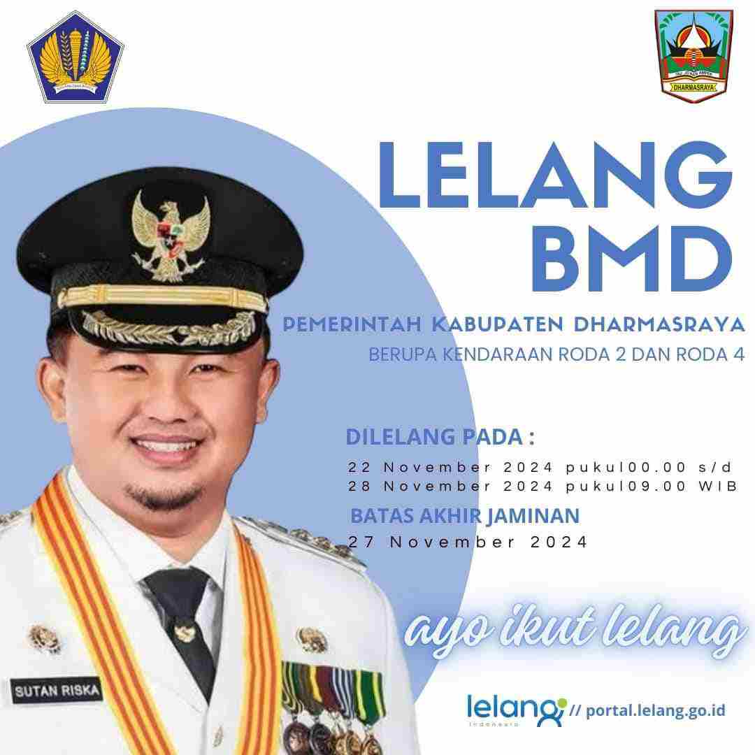 DHARMASRAYA -Pemerintah Kabupaten Dharmasraya melalui perantara Kantor Pelayanan Kekayaan Negara dan Lelang (KPKNL) Padang, akan melaksanakan lelang Non Eksekusi Wajib Barang Milik Daerah (BMD) dengan objek lelang berupa Kendaraan Dinas Operasional/Jabatan dan Scrap/Besi Tua yang sudah tidak digunakan lagi untuk operasional berupa Kendaraan roda 2 dan roda 4, pelaksanaan lelang pada tanggal 22 November 2024 pukul 00.00 s.d 28 November 2024 pukul 09.00. Adapun batas akhir jaminan pada hari Rabu tanggal 27 November 2024.