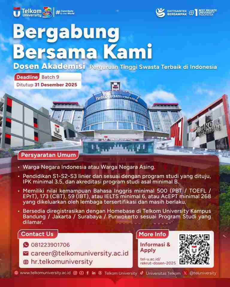 Skip to content Rekrut Dosen Akademisi Telkom University Tahun 2025 dhialdi dhialdi February 17, 2025 Informasi, Karir Eksternal, Lowongan Telkom University sebagai Universitas Swasta terbaik di Indonesia membuka kesempatan kepada para cendekia unggul yang berintegritas dan memiliki semangat untuk berkontribusi membangun Indonesia dengan cara bergabung menjadi Dosen Akademisi, dengan 2 skema rekrut […]