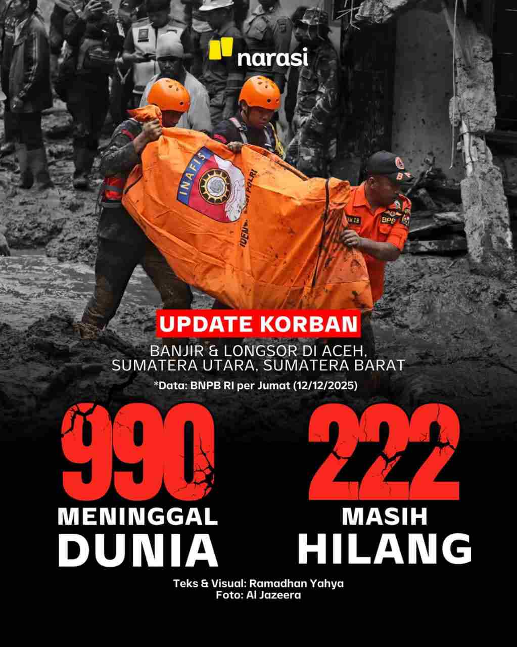 Sumatera-menaramadinah.com-13/12 Korban meninggal akibat banjir dan longsor di Aceh, Sumatera Utara, dan Sumatera Barat, nyaris menembus 1.000 jiwa. Hingga Jumat (12/12/2025), pukul 09.00 WIB, berdasarkan data yang dirilis Badan Nasional Penanggulangan Bencana (BNPB), jumlah korban meninggal sebanyak 990 orang. Rinciannya korban meninggal di – Aceh mencapai 407 orang. Lalu, – […]